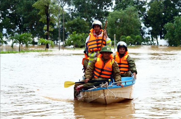 Lực lượng Công an xã tại huyện Lệ Thủy, Quảng Bình tích cực hỗ trợ người dân vùng bị ngập lụt. Ảnh: Tá Chuyên/TTXVN